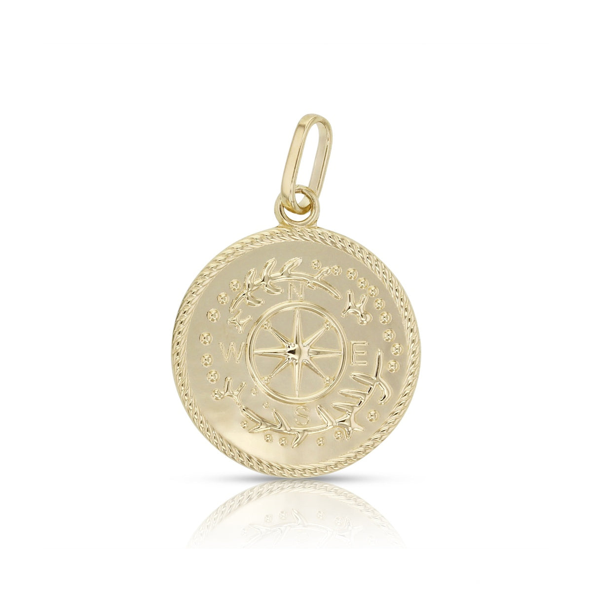 9ct Yellow Gold Flat Disc Compass Pendant. With North East South West. Similar to a Pirate Coin. Flat Back. 20mm in Size.