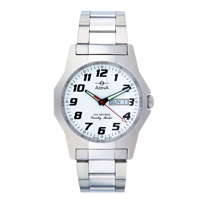 The stylish yet clear white full figured Adina Country Master Australian built work watch is highlighted in the robust nickel free all stainless steel case and bracelet with the bracelet featuring a safety catch on the three-fold clasp. Perfect to be worn every day including swimming and showering being 10ATM water resistant and of course working in. Watch operation is simple through the Bi-oring crown and the Swiss Made Ronda 715 day/date movement is protected behind a tough sapphire crystal glass.