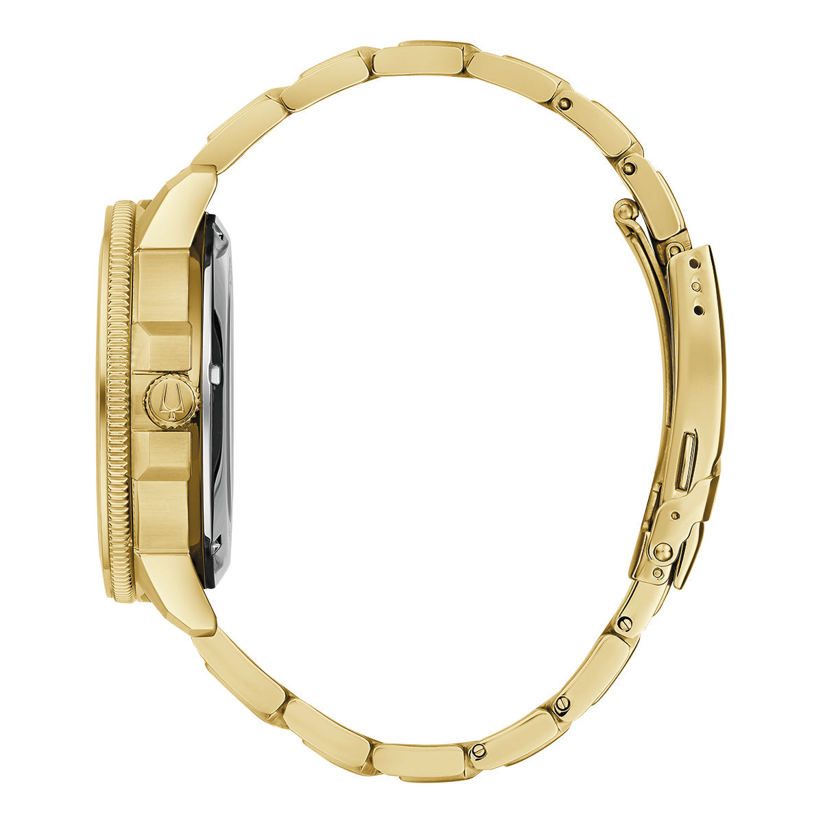 The newest addition to the Marine Star Automatic men's classic watch collection features a sporty elegance with a nautical appeal that is all in the details. The brushed gold-tone stainless steel case is accented by the black 3-hand dial with a rotating bezel and an exhibition window that showcases the automatic 21 jewel movement to ensure optimal performance. The gold-tone stainless steel bracelet has a sport fold-over buckle with pushers for easy access and a seamless look. This watch is water resistant up to 200 meters and is the perfect look for stylish adventures on land and sea.