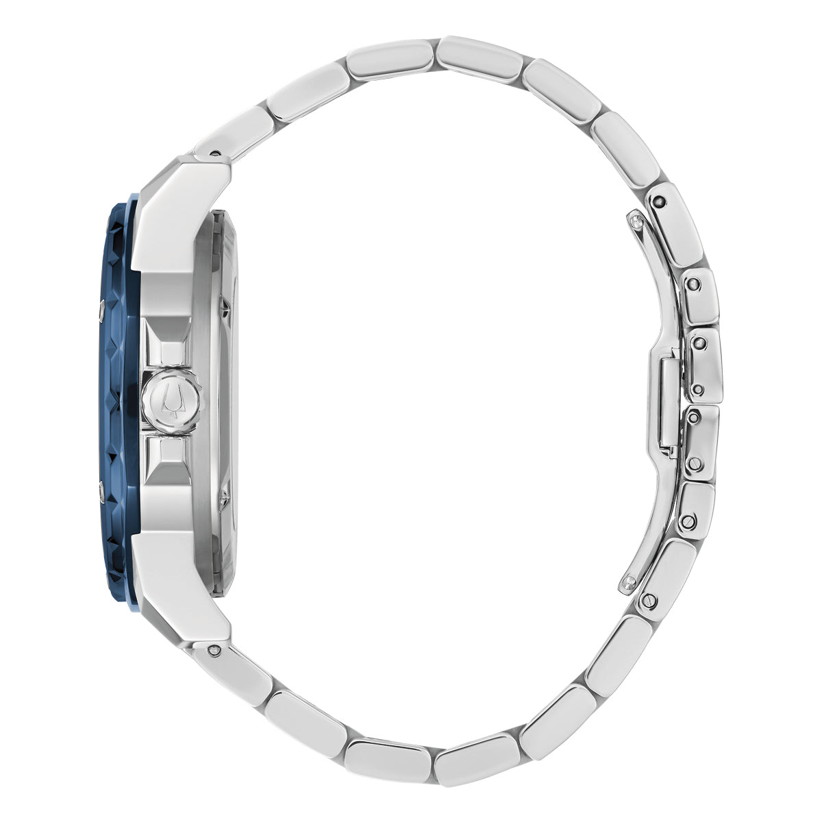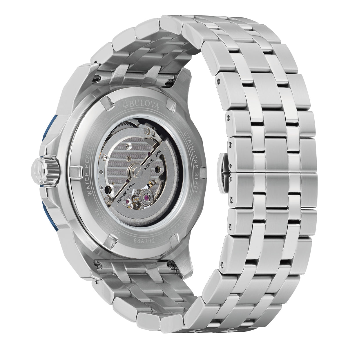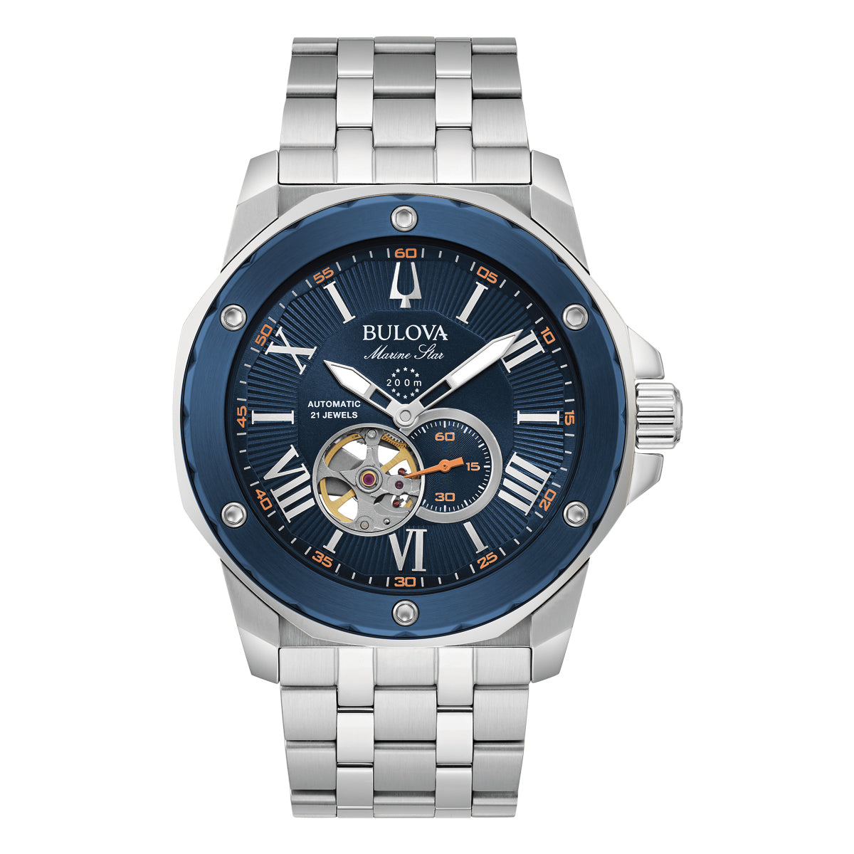 The Bulova Marine Star men's watch is a classic timepiece with a legacy stretching back decades. The open heartbeat automatic 21-jewel movement is showcased in the dial?aperture and in the exhibition case back. The stainless-steel case is accented with blue and features a blue dial and a flat mineral crystal. The watch features a stainless-steel bracelet and is water resistant to 200 meters, living up to its name as a timepiece that can go wherever you do without missing a beat.