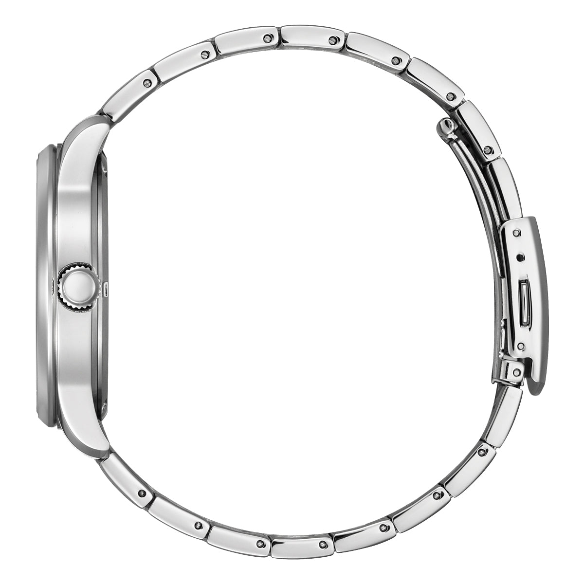 A popular design, this simple and elegant men’s business/dress style will take you from day to evening. Characterised by a simple and clean design, the band is brushed stainless steel bracelet surrounding a 41.8mm stainless steel case and a stunning white brass dial finish providing an elegant touch. Featuring 3 hands and topped with a mineral crystal glass. Enhanced with Eco-Drive technology which allows your battery to self-charge from any light source, this model is also water resistant to WR100/10 bar. A reliable timepiece with a classic design, a watch for every occasion.