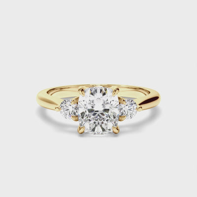 This timeless custom-made cushion cut diamond trilogy engagement ring, made with your choice of diamond centre stone, features round brilliant cut diamond side stones set in a half round band. Exuding fluidity in its line work, and boasting an elegant silhouette, as with all the pieces in our Bespoke Collection, this piece is made especially for you.