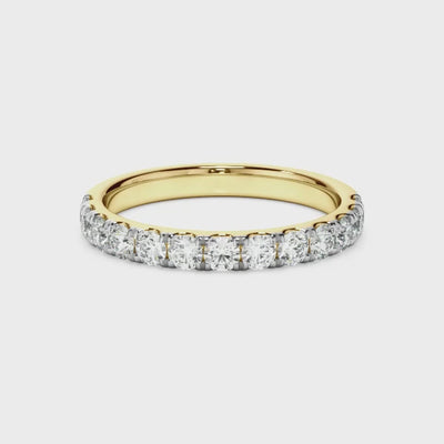 This stunning custom-made wedding ring features a half band of round brilliant cut diamonds set on an 18ct gold or platinum band. Exuding fluidity in its line work, and boasting an elegant silhouette, as with all the pieces in our Bespoke Collection, this piece is made especially for you.