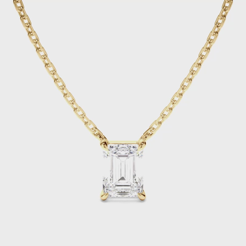 This elegant emerald cut diamond necklet is made with your choice of diamond centre stone, and includes a 45cm 18ct gold chain. Exuding fluidity in its line work, and boasting an elegant silhouette, as with all the pieces in our Bespoke Collection, this piece is made especially for you. Pictured here with a 1.00ct Emerald Cut Diamond, a final price is determined following your centre stone selection.