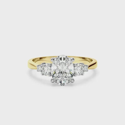 This timeless custom-made five stone diamond engagement ring, made with your choice of diamond centre stone, features an oval cut centre stone complimented by round brilliant cut side stones. Exuding fluidity in its line work, and boasting an elegant silhouette, as with all the pieces in our Bespoke Collection, this piece is made especially for you.